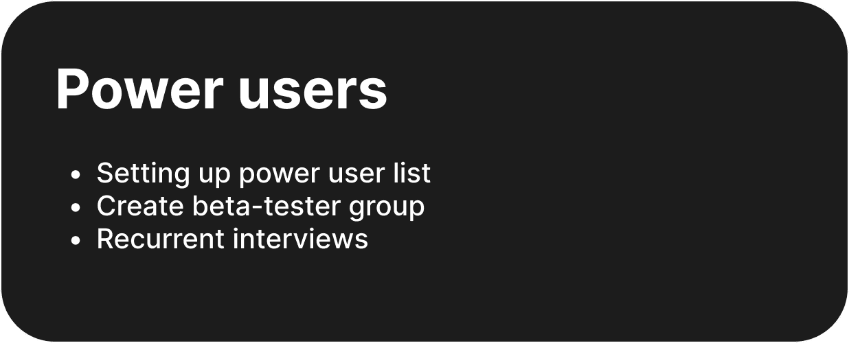 Understand painpoints, churn rate, exchange, list power users, create beta tester’s base list, interviews, need list.