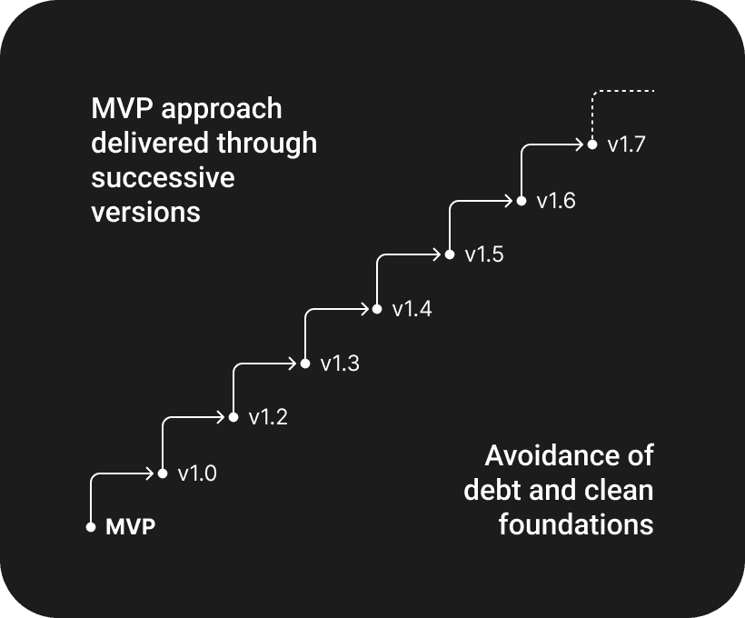 Design the MVP as a scalable foundation: v1.0 focuses on core functionality, while v1.7 builds on it with more advanced features, anticipating future needs and preventing technical debt.