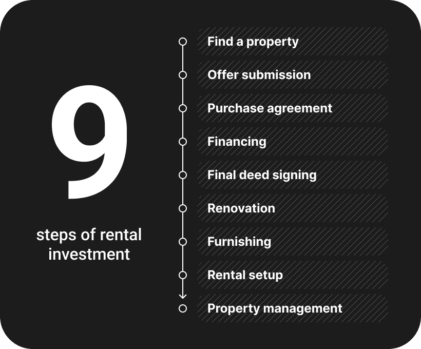 How rental investment works, advizor interviews, major steps, under-steps, simplify, necessary documents, who intervines, when, investment time length (6-7 months), finance search (usually around 70 days).